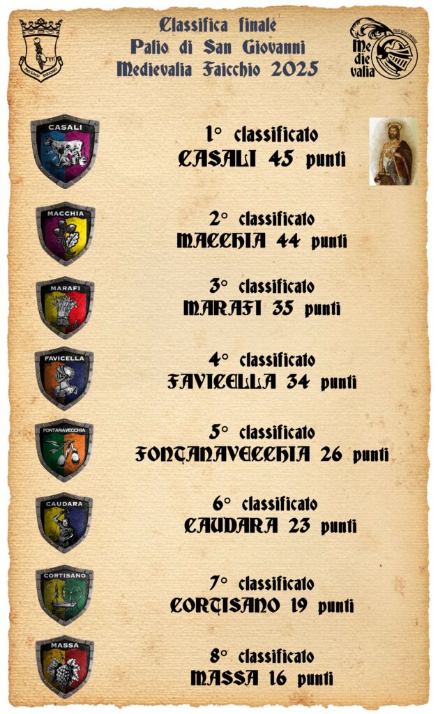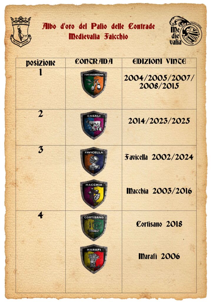 Albo d’oro del palio delle contrade di Medievalia Faicchio e delle sette edizione della Festa Medioevale di Faicchio. Il palio delle contrade, dal 2015, è intitolato a San Giovanni Battista, patrono del comune di Faicchio. Al termine della festa, la contrada vincitrice si aggiudica l’arazzo raffigurante San Giovanni.